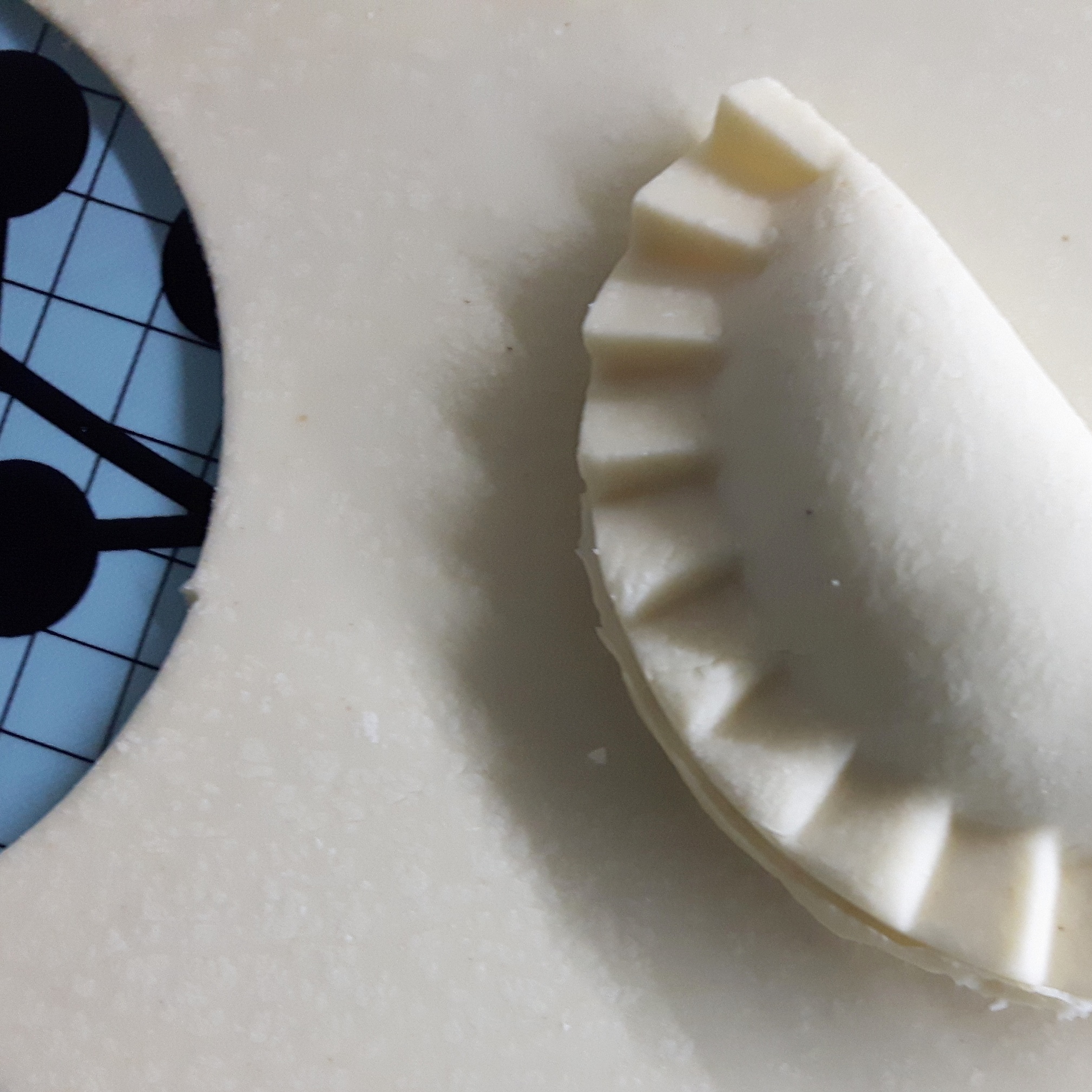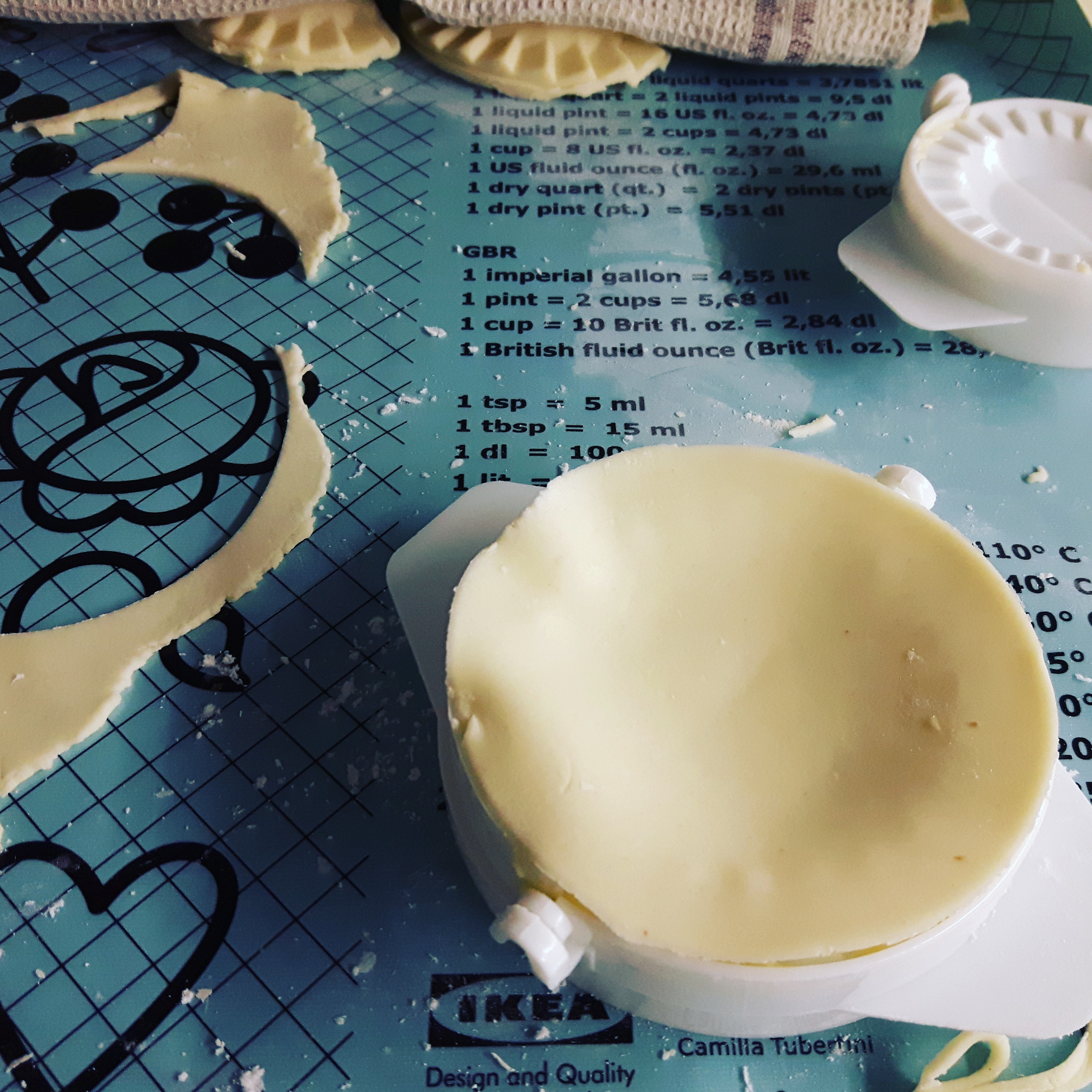 Żeby ułatwić sobie życie, do wyrobu pierogów używam – jak widzicie na poniższych zdjęciach – profesjonalnego sprzętu – foremek za 5 zł. ;] Bardzo się sprawdzają przy tego typu cieście. Byleby nie napakować za dużo farszu do środka.